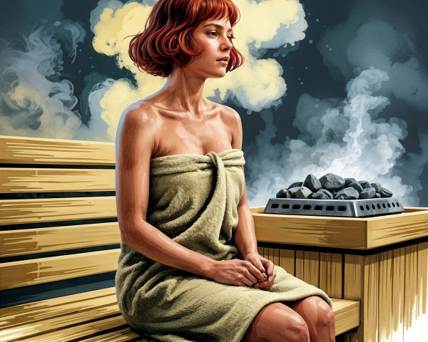 A woman in a black outfit rests on a green sofa, reading a book and holding a bottle. A portrait of her, with similar features, hangs on the wall behind her. The scene conveys a sense of contemplation.