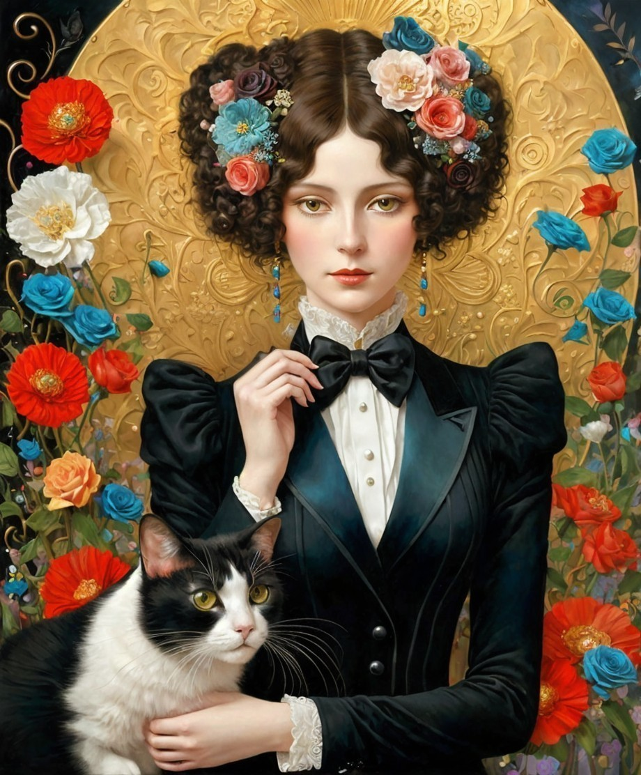 An illustrated woman with striking features in a tuxedo, adorned with flowers in her hair, holds a black and white cat, with a floral backdrop.