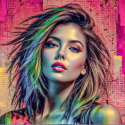 A striking portrait of a woman with long, dark hair, set against a vibrant background of pink, gold, and teal abstract textures, evoking a blend of modern art and emotion.