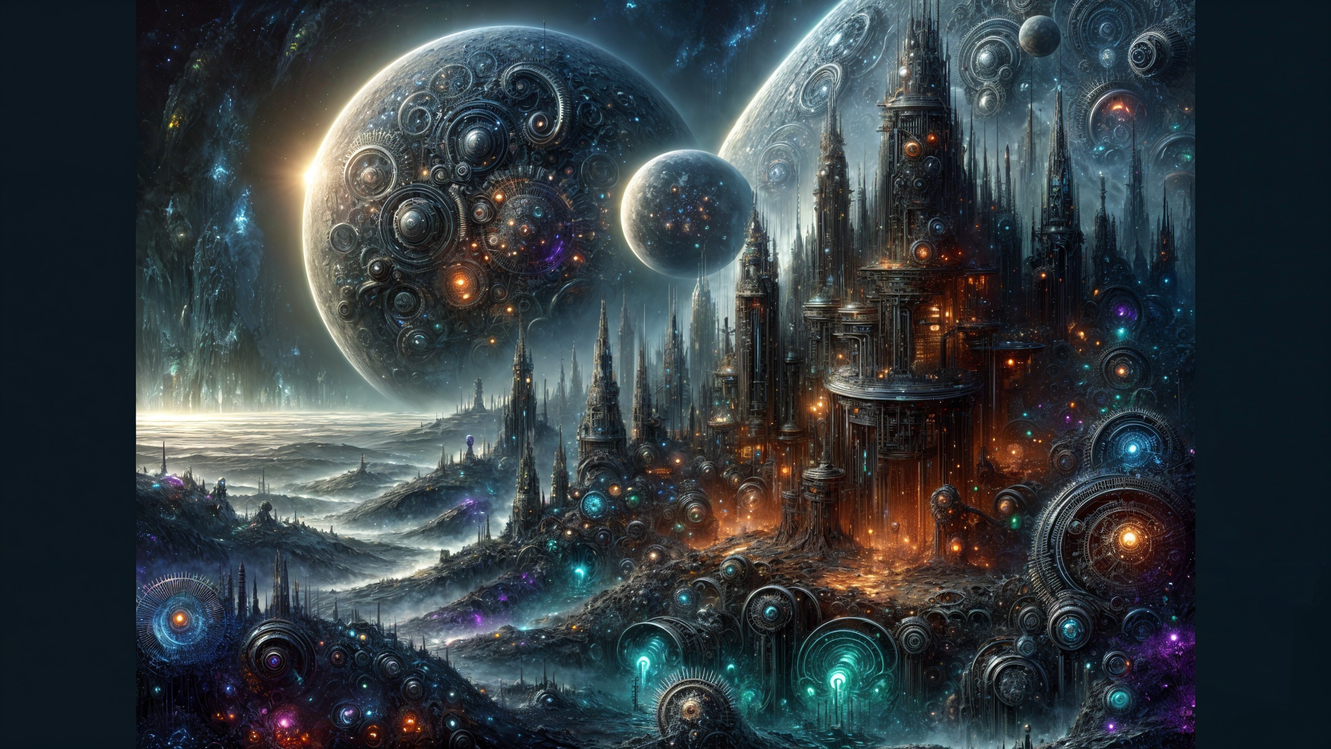 Visualize a distant alien planet shrouded in a dense, iridescent haze that glimmers with dark blues, purples, and metallic grays. The planet’s surface is jagged and uneven, dominated by towering, Gothic-style mechanical structures with intricate steampunk details—gears, pipes, and glowing neon circuits embedded within their walls. The air is thick and swirling with steam and smoke, illuminated faintly by the eerie glow of twin moons casting long shadows. Alien flora resembling twisted, metallic vines and glowing, bioluminescent fungi spread across the landscape. Strange, insectoid alien creatures with metallic exoskeletons scuttle through the haze, their movements precise and mechanical. In the distance, the silhouette of an enormous, rotating, gear-like citadel rises, pulsating with an ominous crimson light. glossy wallpaper