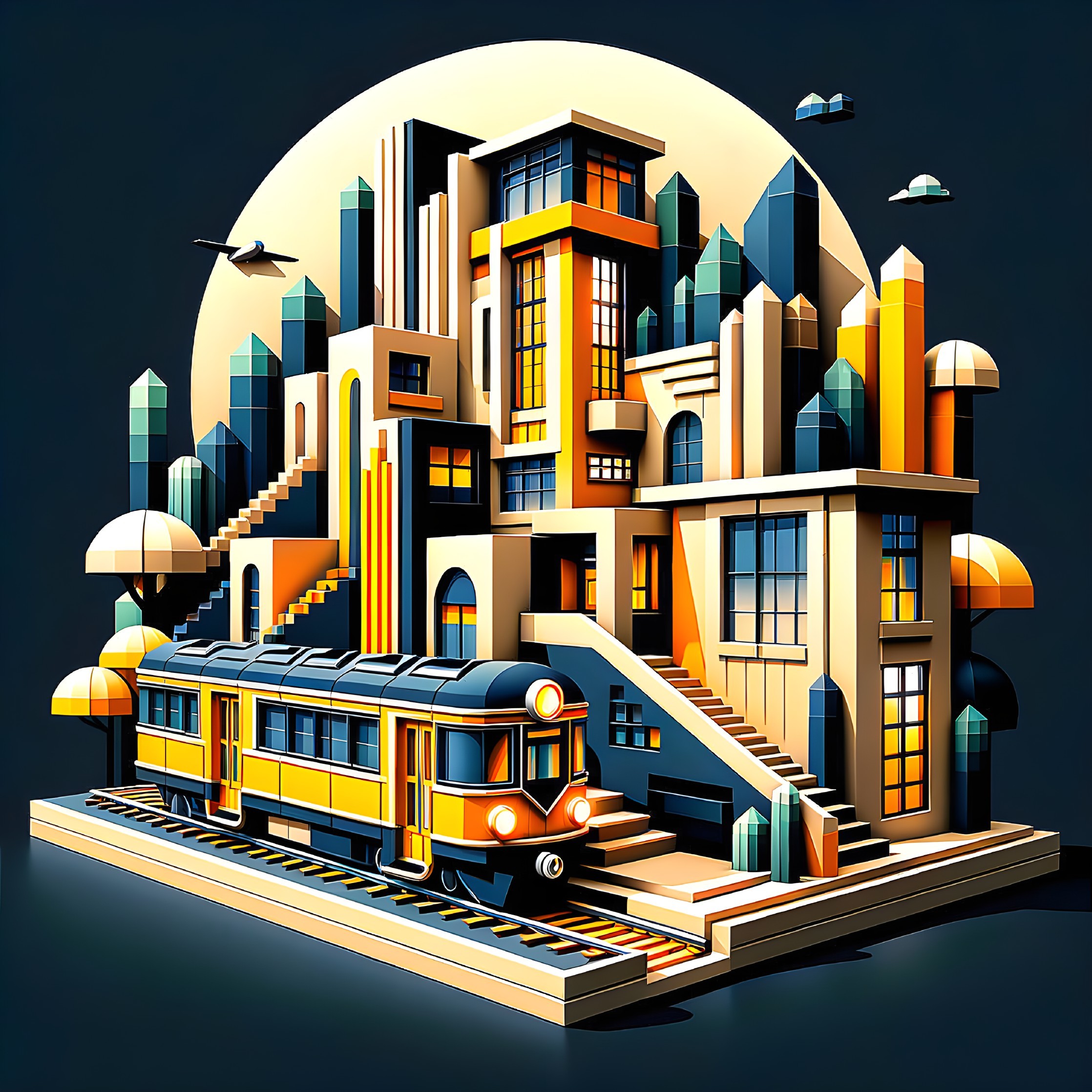 Train: In the foreground, there is a train, also designed with geometric and modern aesthetics. It appears to be in motion, adding an extra layer of dynamism to the image.