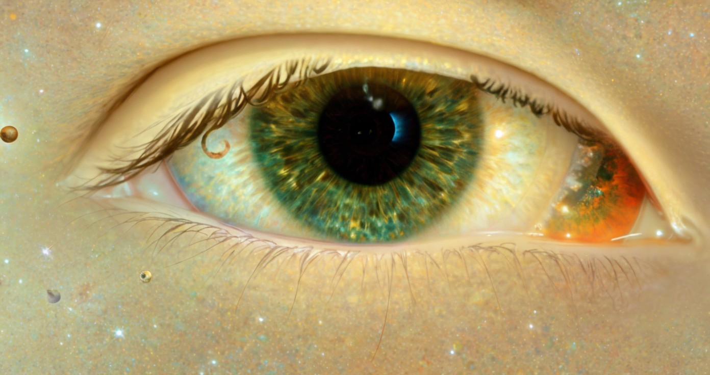 A macro image of a human eye with a multicolored iris containing galaxy patterns, showcasing a blend of cosmic and human elements.
