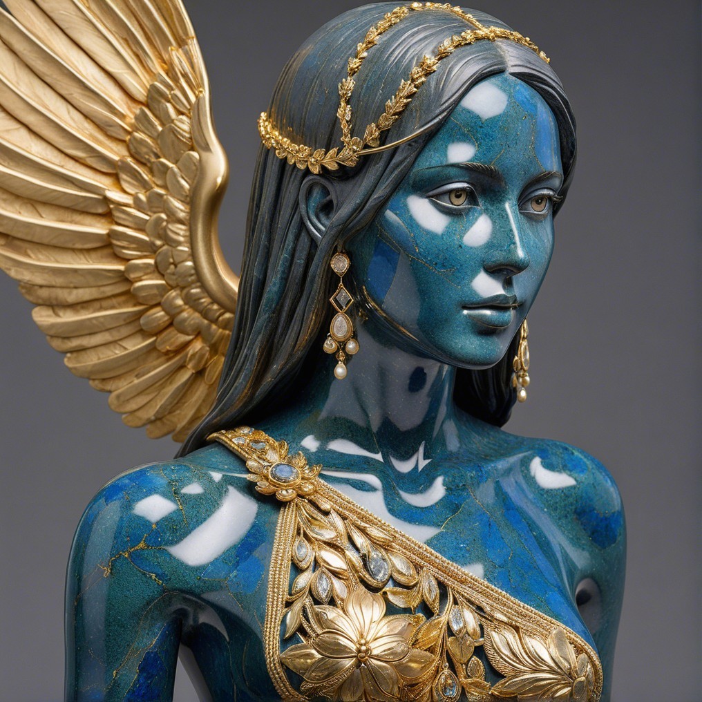 A striking figurine featuring a woman with blue stone-like skin, adorned with intricate gold and jewel accents. Her elegant pose and elaborate jewelry create a stunning, regal appearance.