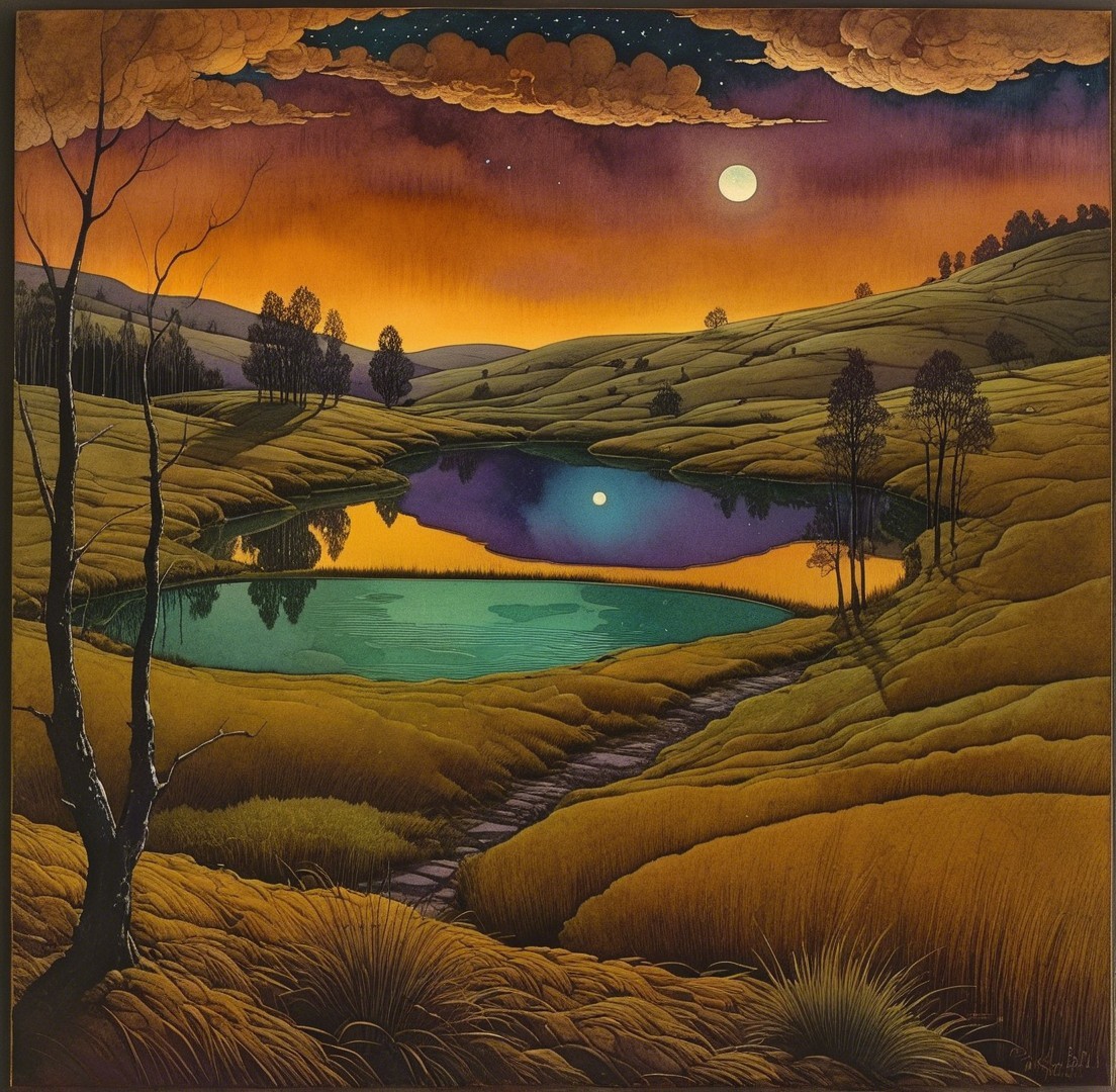 A serene landscape at dusk, featuring a reflective lake surrounded by lush hills. The sky transitions from vibrant orange to deep purple, illuminated by a glowing moon and scattered stars.