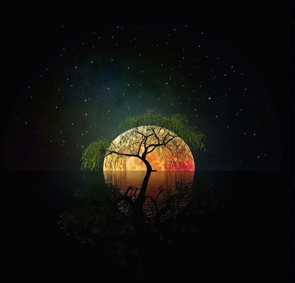 A surreal scene features a solitary tree silhouetted against a vibrant, glowing moon, surrounded by a starry sky and reflecting in calm waters, creating a mesmerizing and tranquil atmosphere.
