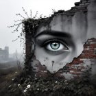 The image features a striking green eye emerging from a cracked wall, surrounded by vines and flowers. The scene is a blend of grayscale and vibrant color, evoking a haunting yet poetic atmosphere.