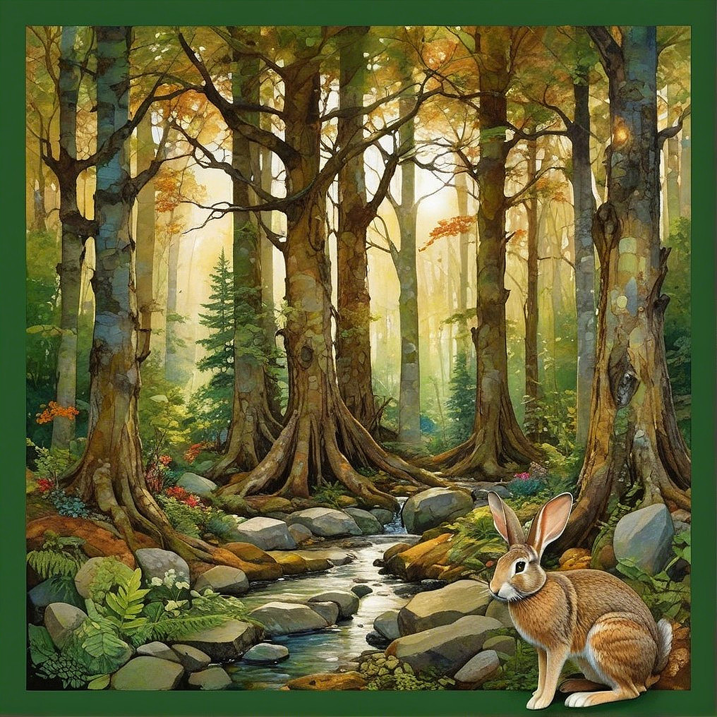 A serene forest scene features tall trees with vibrant foliage and a gentle stream winding through. A brown rabbit sits near colorful flowers, creating a tranquil, picturesque atmosphere.