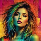 A captivating portrait of a young woman with vibrant turquoise hair. She wears colorful earrings, set against a bold, abstract background of warm oranges and pinks, exuding confidence and beauty.