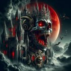 A menacing figure adorned in ornate armor, featuring a skull mask and striking red hair. The background showcases dark castles and a dramatic sunset, enhancing the eerie atmosphere.