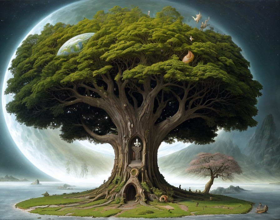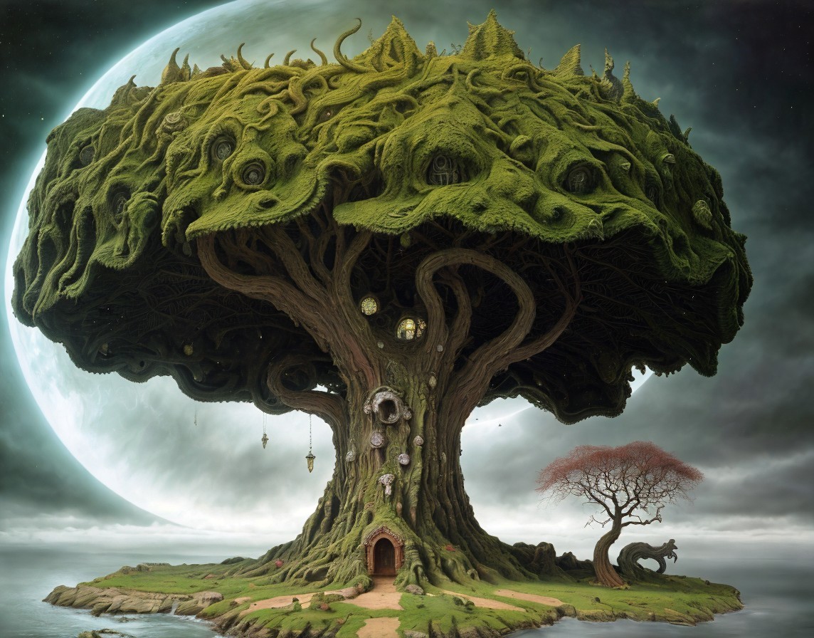 A fantastical image depicting a giant mushroom-like structure adorned with blue orbs and smaller mushrooms scattered around, set in an otherworldly landscape.
