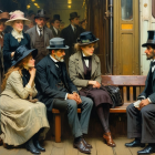 A vintage scene inside a train, featuring elegantly dressed men and women in hats. They sit in a row, reflecting a mix of emotions in their expressions amidst a muted, classic atmosphere.