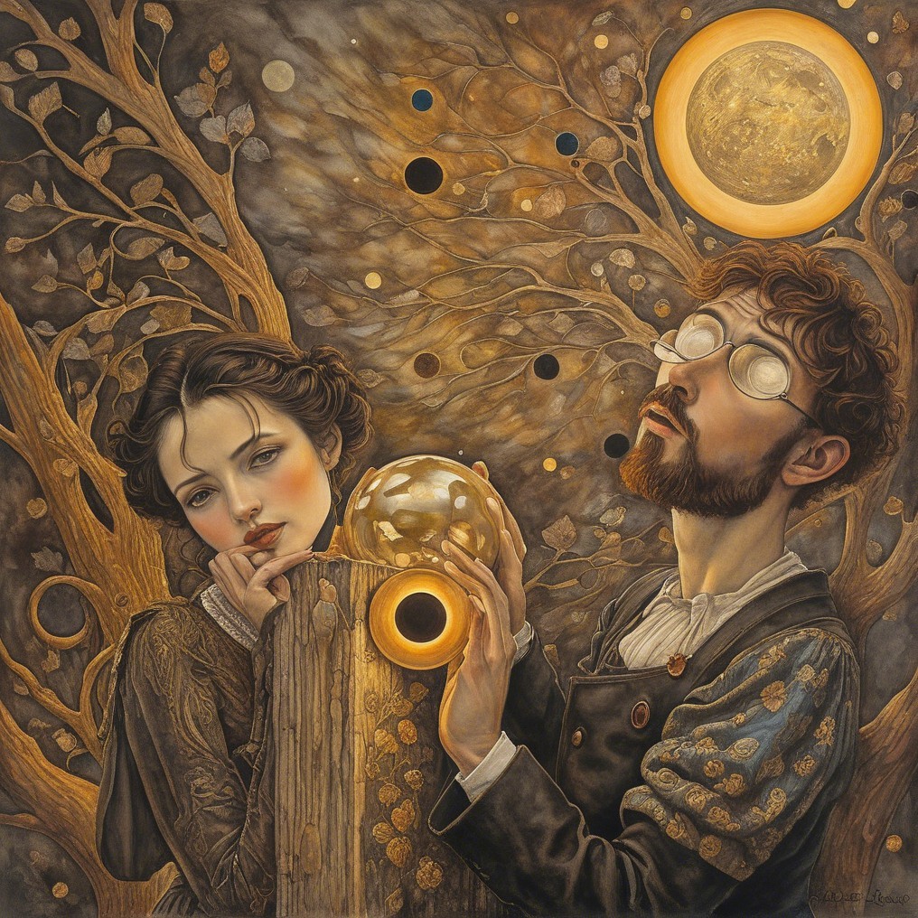 A romantic couple stands by the sea, embraced under a full moon. The woman has flowing red hair, while the man, dressed in vintage attire, gazes tenderly at her, creating an intimate atmosphere.