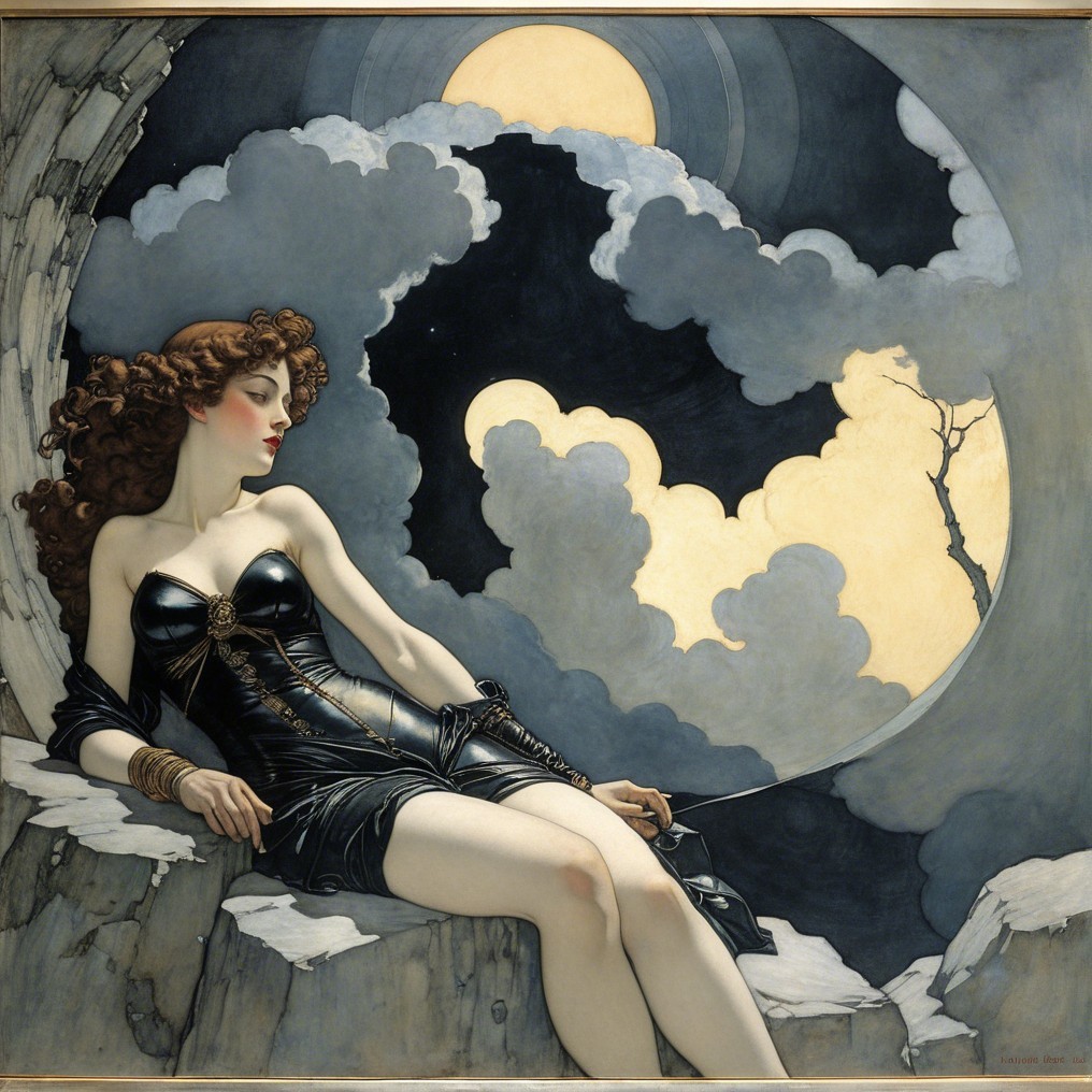 A woman with flowing hair sits elegantly, bound lightly, against a surreal backdrop of two large moons. She gazes intently, blending beauty with an air of mystery and tension.
