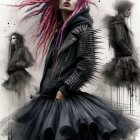 A striking figure with vibrant purple hair stands confidently in a leather jacket and flowing black skirt, surrounded by ethereal, shadowy reflections of herself, exuding a bold elegance.
