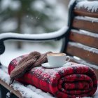 A cozy winter scene features a wooden bench draped with a warm, red blanket and soft pillows. A steaming cup rests on a saucer, surrounded by snow-covered trees and falling leaves.