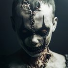 A striking figure with dramatic face paint featuring dark markings and striking yellow eyes. The atmosphere is eerie, enhanced by smoky shadows in the background, creating a hauntingly captivating scene.