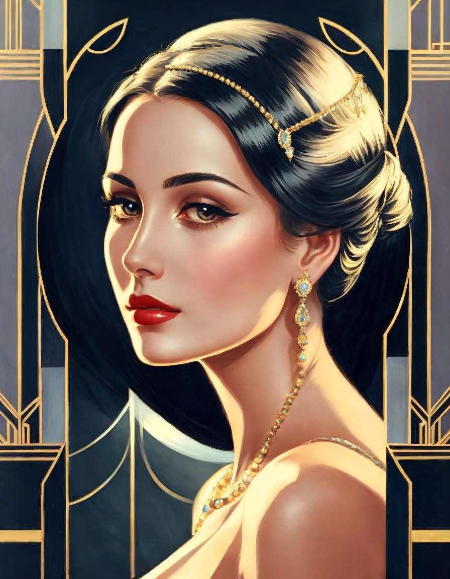 Illustrated portrait of woman with black hair, red lipstick, Art Deco jewelry.