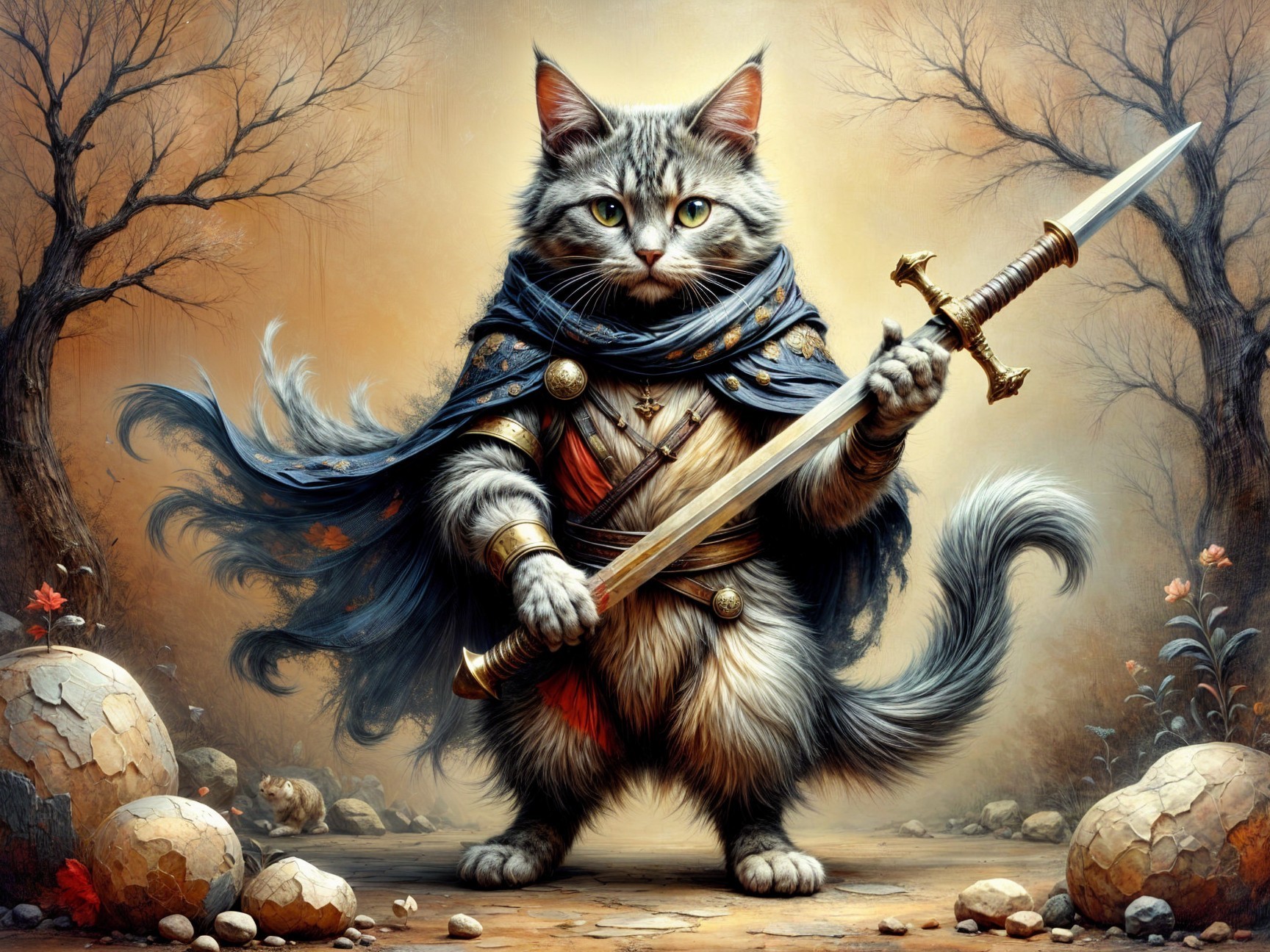 A regal cat adorned in a majestic cloak holds a sword, standing amidst a whimsical landscape of autumn leaves, mystical trees, and a cracked golden orb, evoking a fantasy world.