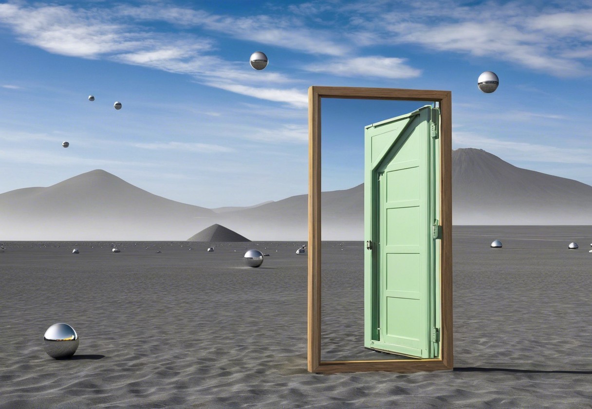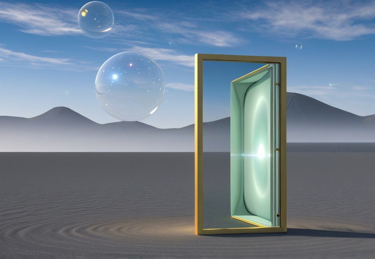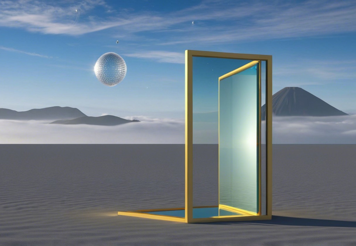 A surreal scene features a yellow-framed mirror reflecting a tranquil landscape, with floating crystal spheres and distant mountains amidst a foggy, serene atmosphere.
