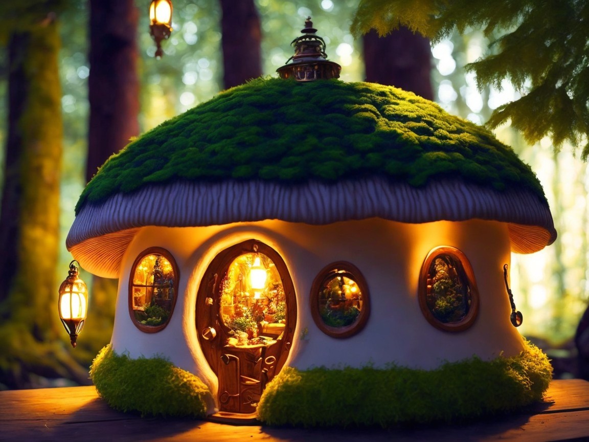 A whimsical mushroom-shaped house nestled in a forest, adorned with a green, mossy roof and colorful candy-like decorations. Warm lights glow from round windows, creating a cozy, magical atmosphere.