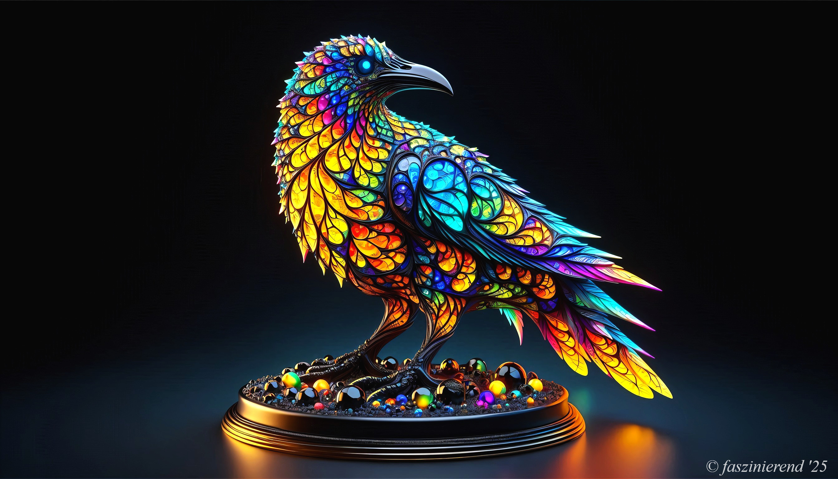 A vibrant, intricately designed raven glimmers with colorful, jewel-like feathers. It stands on a decorative base, surrounded by shining orbs, exuding a mystical and artistic allure.