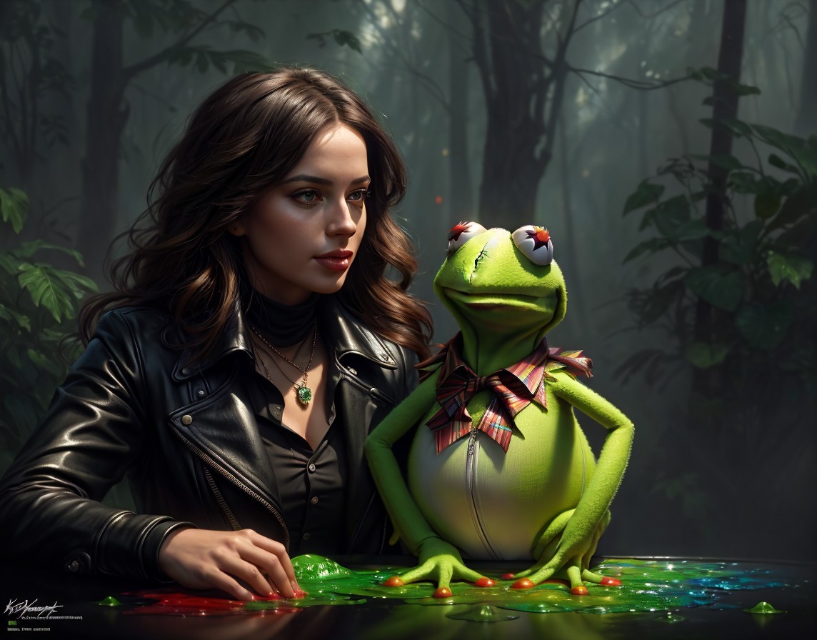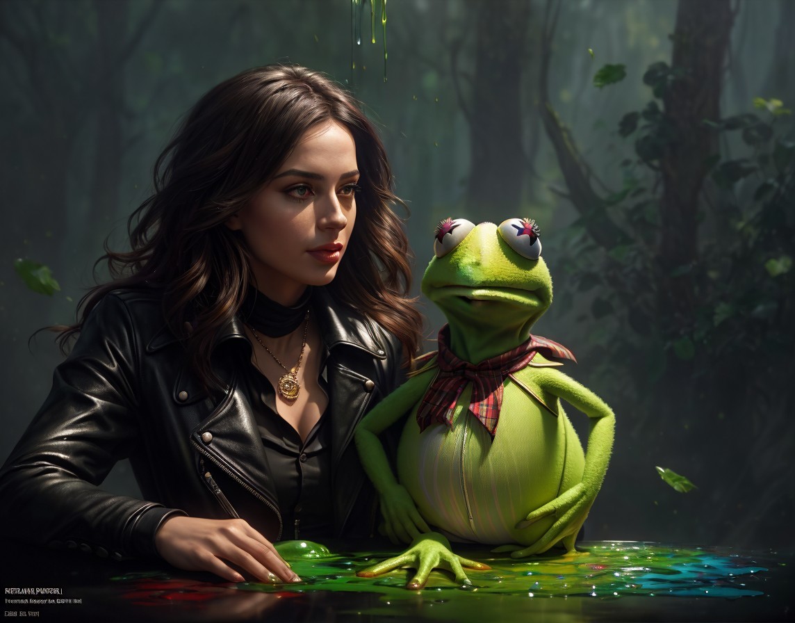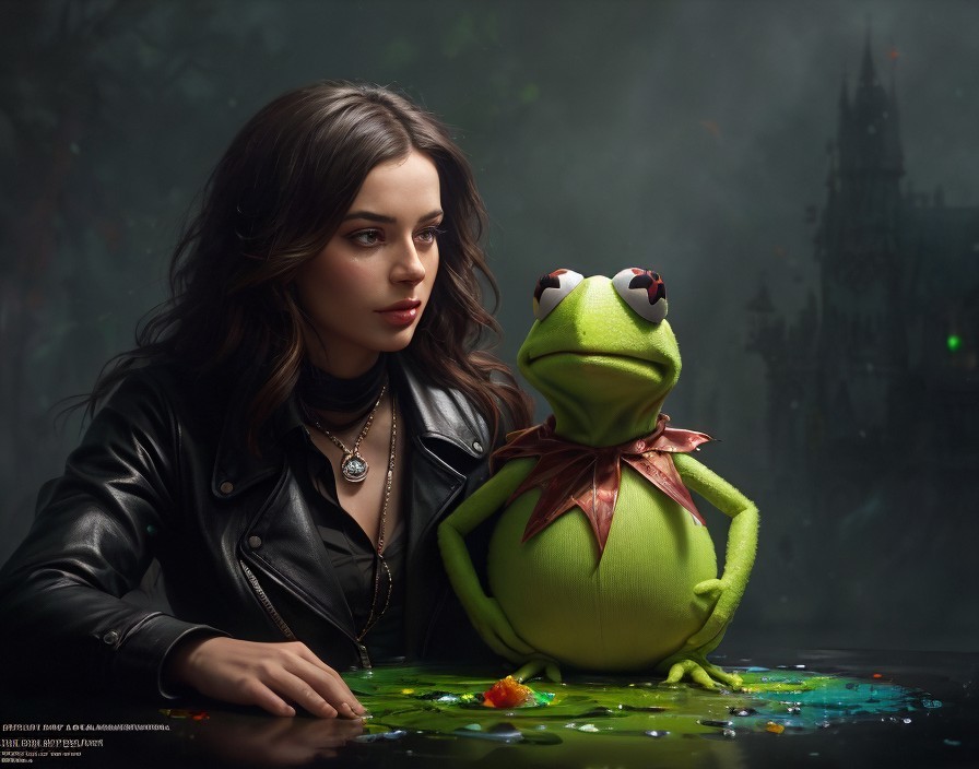 A woman in a leather jacket gazes intently, accompanied by Kermit the Frog in a bow tie, both resting hands on a multicolored surface.
