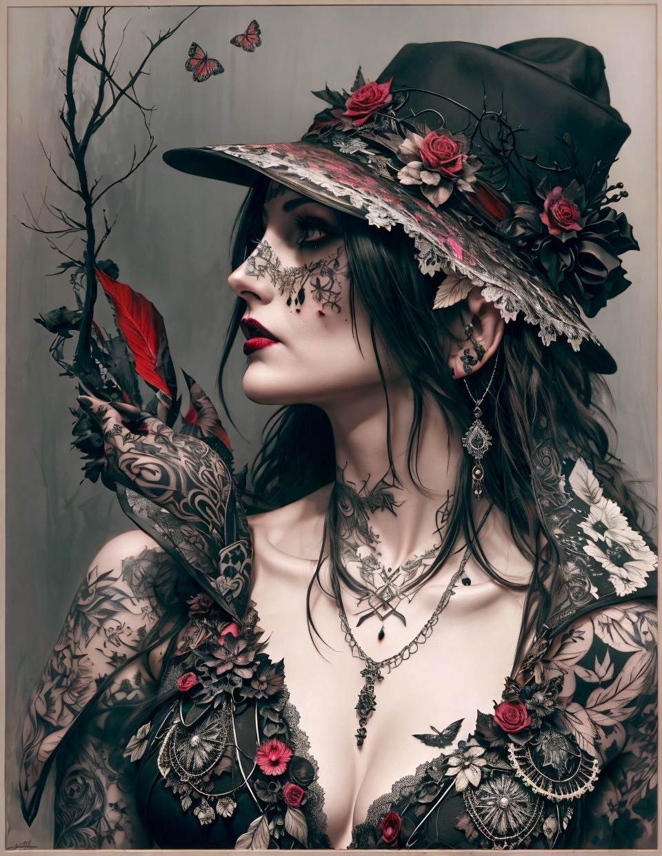 + Prompt:Eine Schwarzwälder Trachtenfrau mit Hut, screaming and tattoo, intricate, sharp focus; art by Carne Griffiths, michael hussar, fine art, elegant, cinematic lighting, 69k concept art; deep color; ink drawing; tO