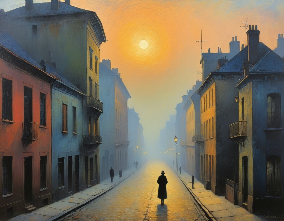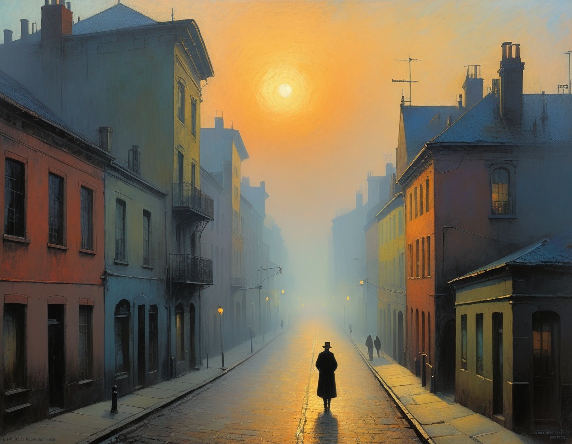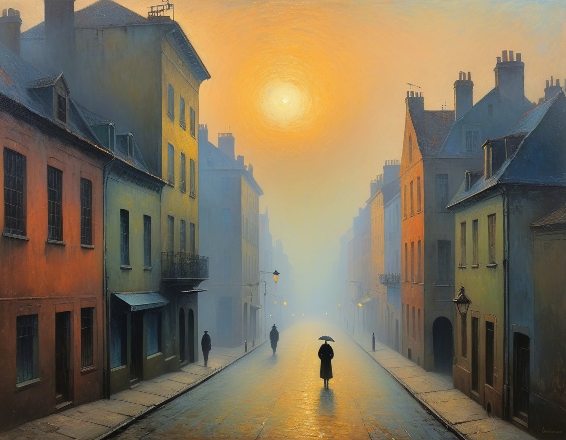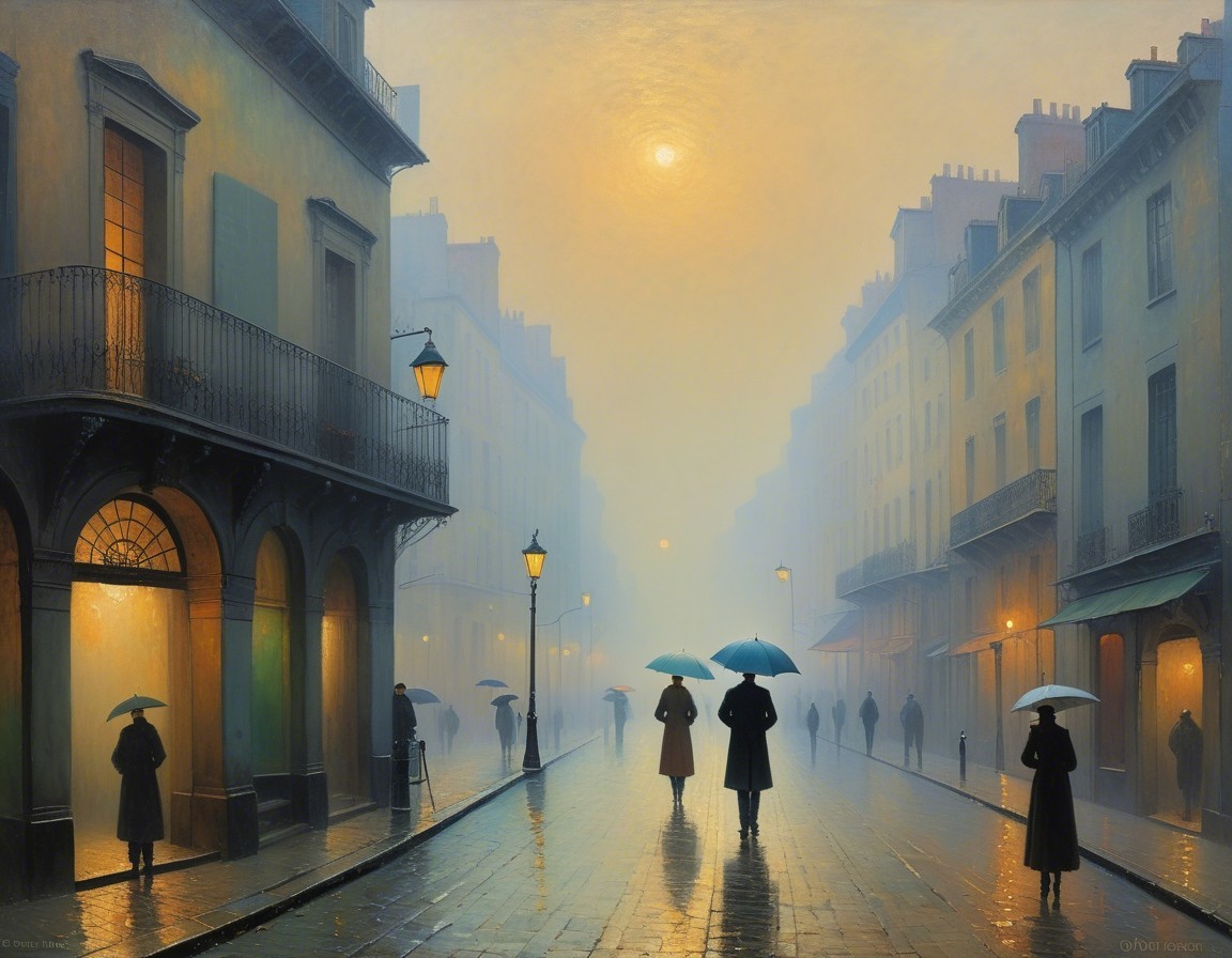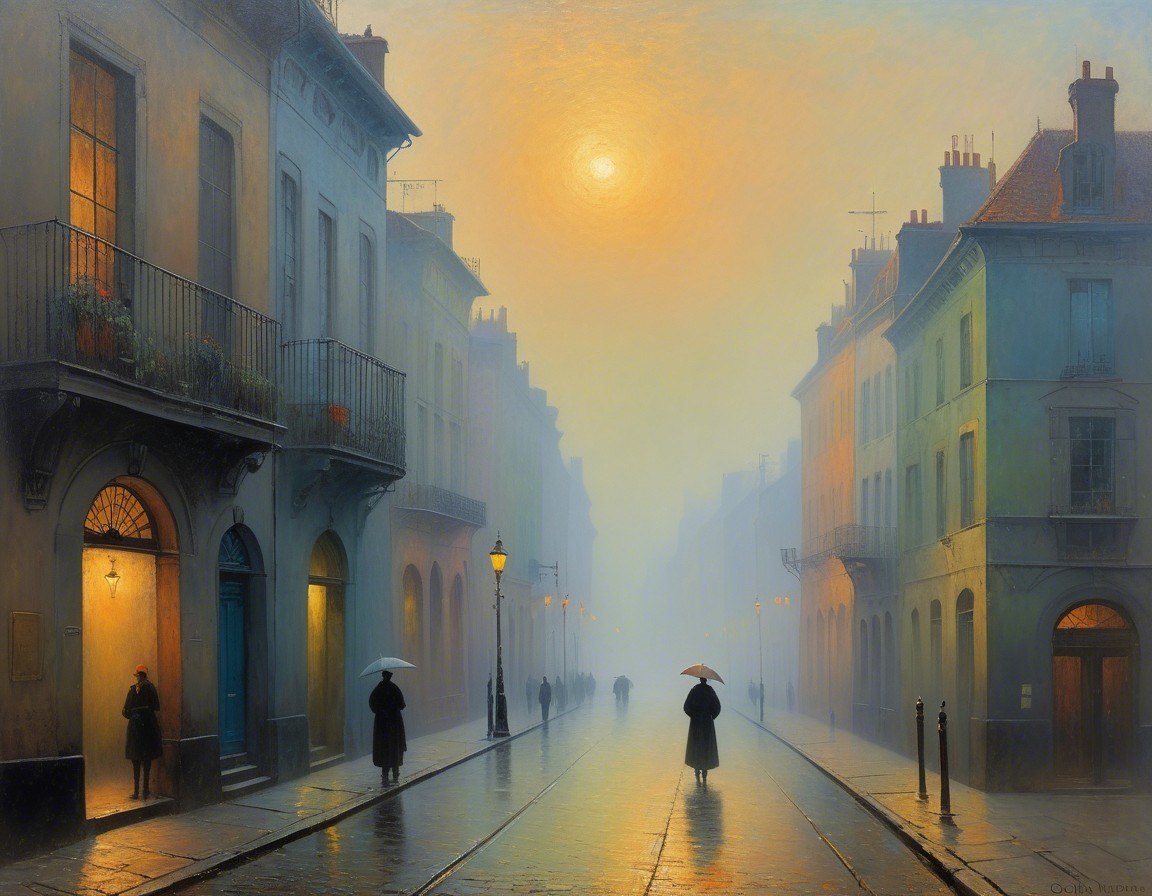 A misty street scene, with silhouettes of people walking under umbrellas. Warm lights glow softly from storefronts, while the sun sets hazily in the background, creating an atmospheric mood.