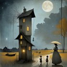 A whimsical, multicolored treehouse towers amidst swirling skies. Surrounded by autumn trees and a reflective pond, it glows warmly under a large, luminous moon, creating a magical atmosphere.