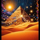 A stunning scene showcases majestic pyramids illuminated by cosmic light in a starry desert sky. Ethereal patterns and bursts of energy radiate above, creating a mystical atmosphere.