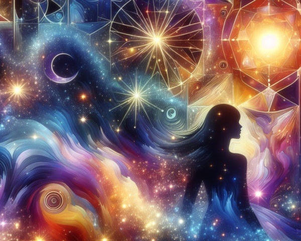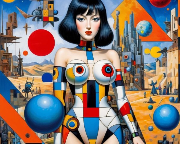 A serene woman in a traditional kimono writes at a desk, surrounded by a picturesque landscape of mountains and cherry blossoms, embodying beauty and tranquility in her art.