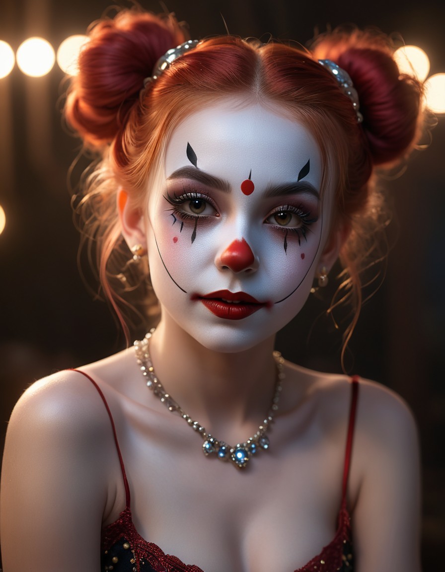 A young woman with red hair styled in buns wears dramatic clown makeup, featuring a red nose, teardrop eyeliner, and a jeweled necklace, set against a softly lit, atmospheric background.