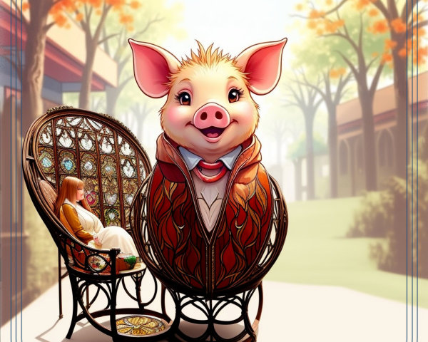 A young woman with braided hair and accessories resembling cat ears holds a tambourine. She wears a stylish, layered outfit against a colorful abstract background, exuding a whimsical vibe.