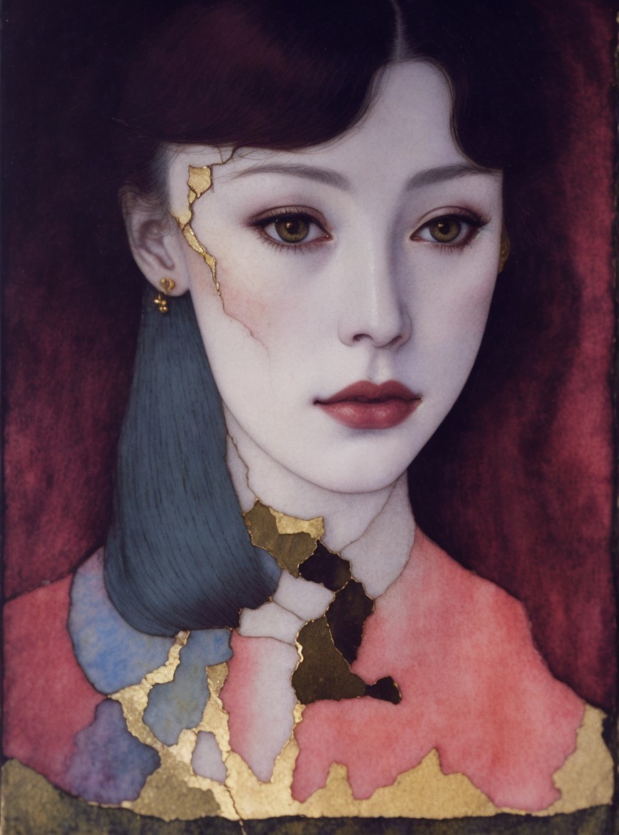 The image features a portrait of a young woman with delicate features. Her skin is smooth, but her face displays intricate cracks outlined in gold, creating a striking contrast with soft colors.