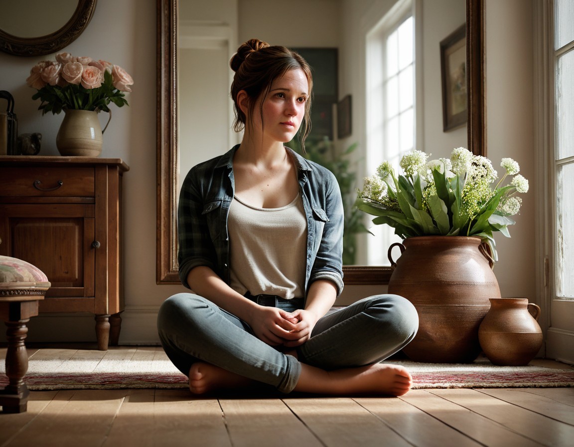 A contemplative young woman sits cross-legged on a rug in a softly lit room. Surrounded by floral arrangements, she gazes thoughtfully, exuding a serene and introspective vibe.