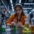 Two scientists in colorful lab coats are intently working together at a table filled with various glass bottles and beakers. Vibrant liquids and a cozy atmosphere create an engaging scene.