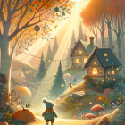 A curious girl in a red jacket and hat walks along a winding path in an autumn forest, passing charming houses with glowing jack-o'-lanterns, under a bright, full moon.