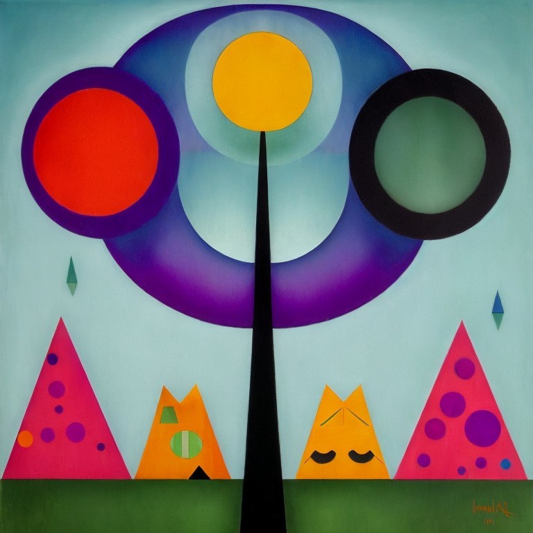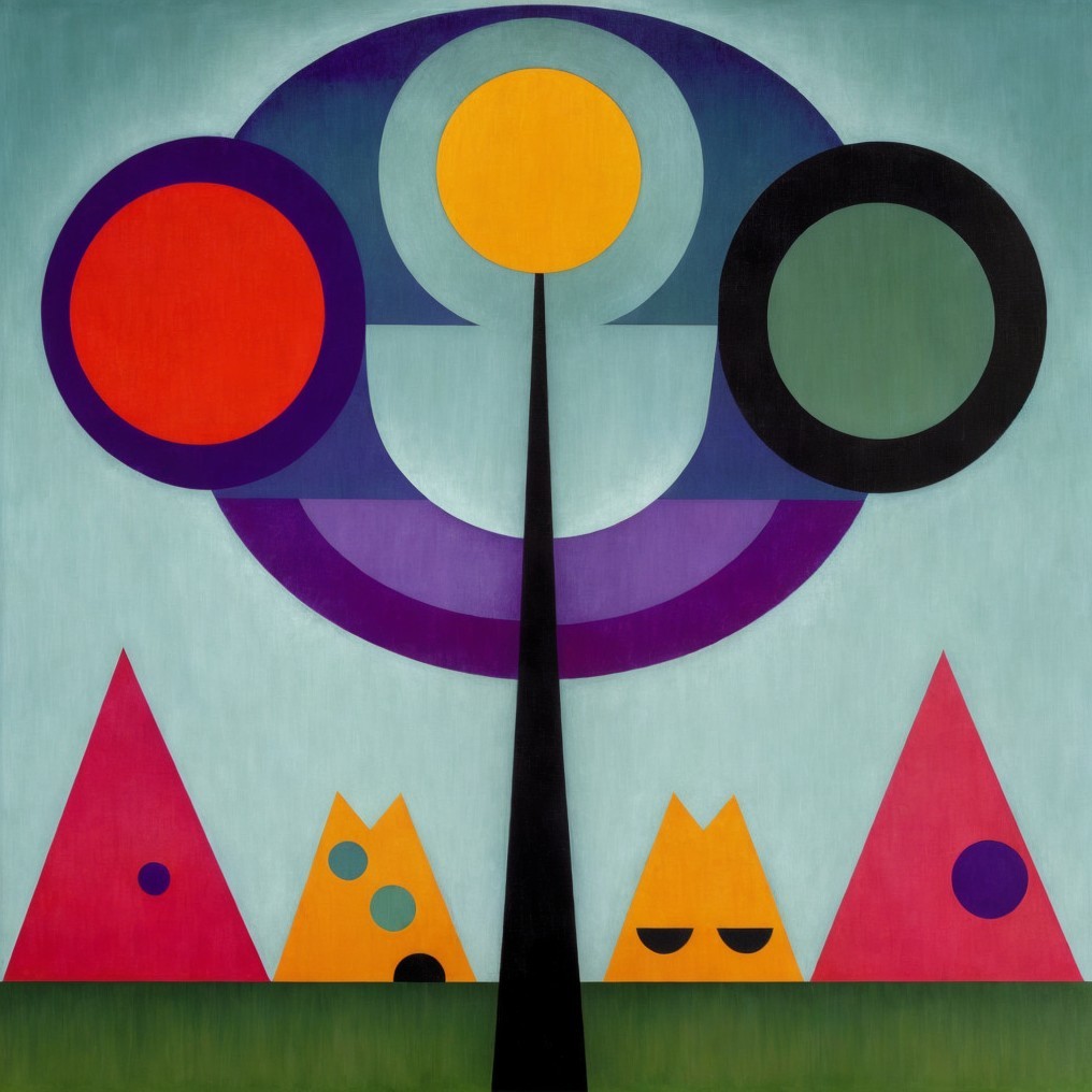 Abstract geometric painting with colorful circles and triangles on a muted background, center split by a vertical line.