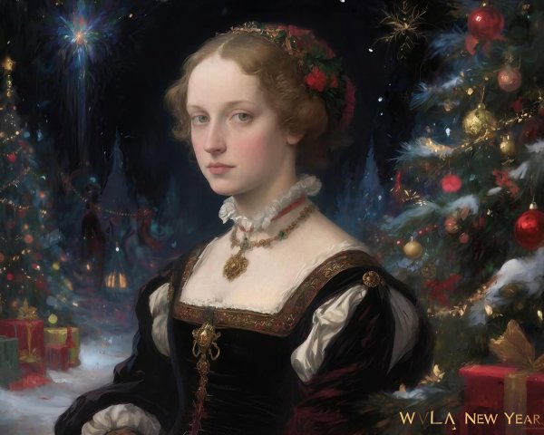 A young woman wears a light blue dress and a daisy crown, sitting gracefully in a lush, green forest surrounded by colorful wildflowers and soft sunlight filtering through the trees.