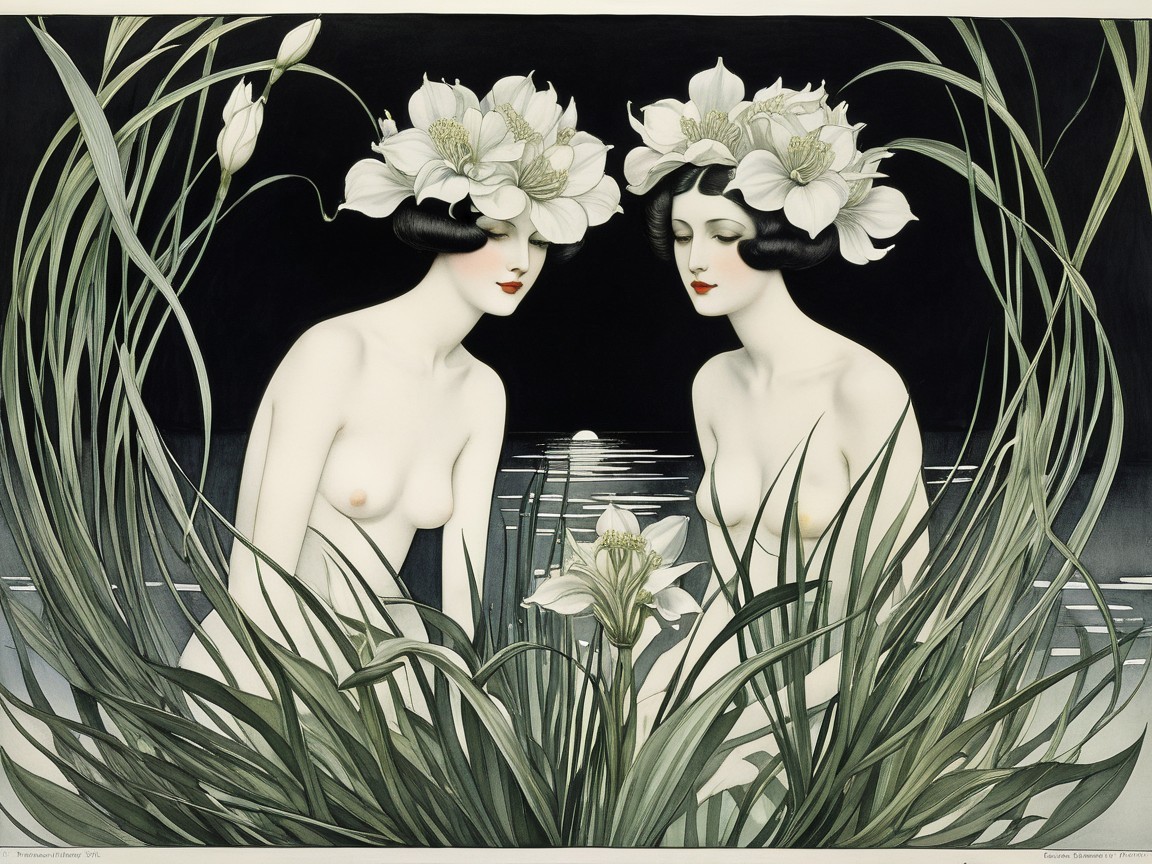 The image features two ethereal women surrounded by lush greenery and white flowers. They wear delicate hairpieces and share an intimate moment, emphasizing beauty and nature.