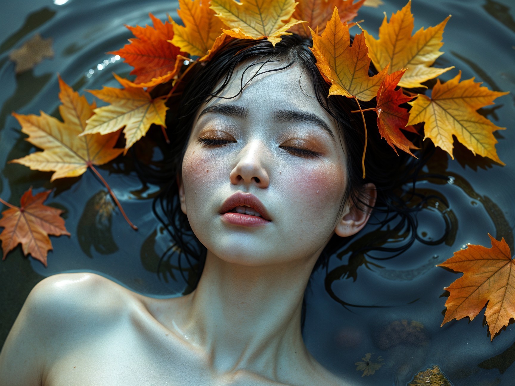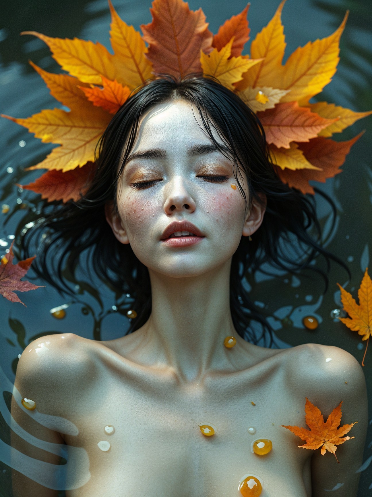 Prompt: "Create an image of a serene and ethereal figure submerged in water, surrounded by vibrant autumn leaves. The figure has a pale, slightly translucent skin tone, with closed eyes and a tranquil expression, suggesting a sense of peace. The face is oval-shaped, with delicate, soft features including high cheekbones and subtle contours. The hair appears to merge seamlessly with the flowing water, depicted as dark and wet, cascading down around the shoulders.