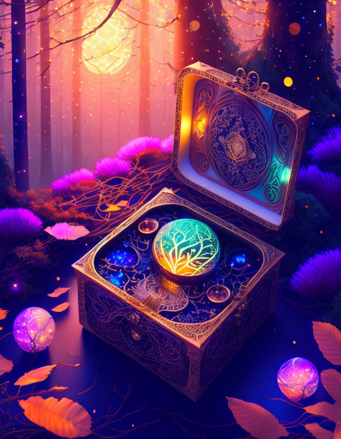 Musical box,Beautiful hyperdetailed bejwelled gothic bioluminecent musical box open, musical instruments and planets coming out of the box, zentangled, stunning forest nightscape, vapour, magical