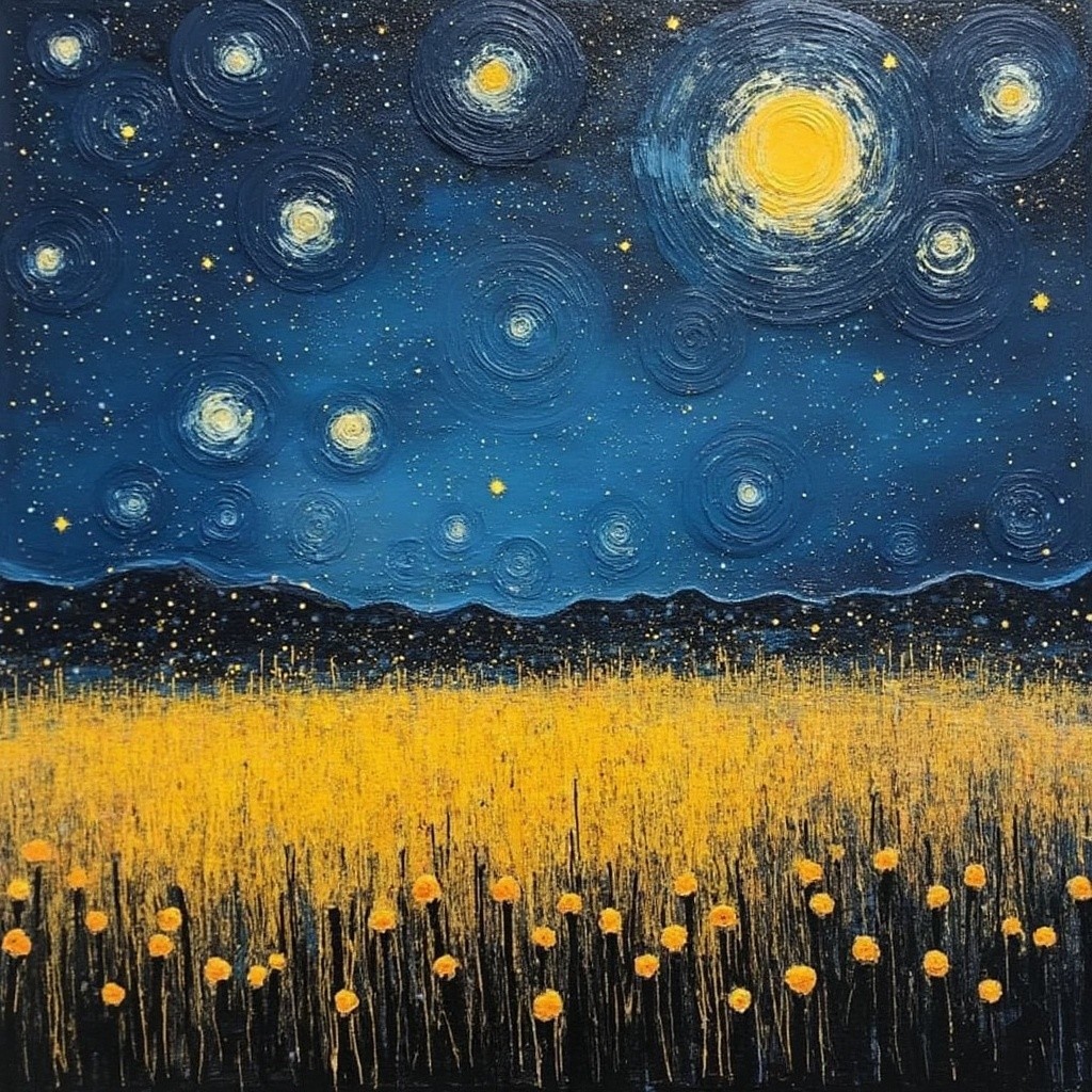 A vibrant night scene features a golden field of flowers under a starry sky. A bright moon and sun shine above, casting a warm glow over the peaceful mountains in the distance.