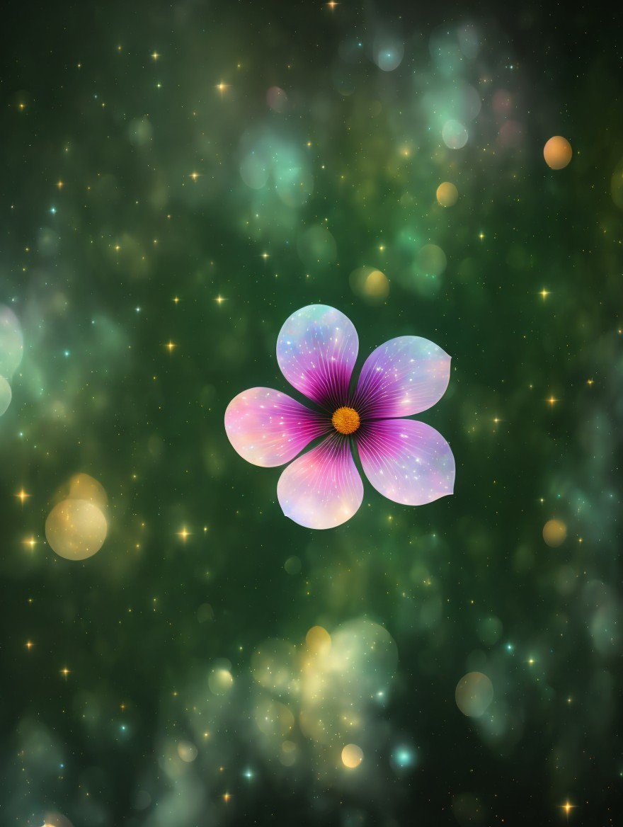 A vibrant pink and white flower against a sparkling green bokeh background.