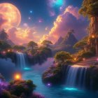 A serene landscape features vibrant pink trees against a twilight sky, a large moon above mountains, and a tranquil lake. A figure in a flowing dress stands on stone steps, admiring the scenery.