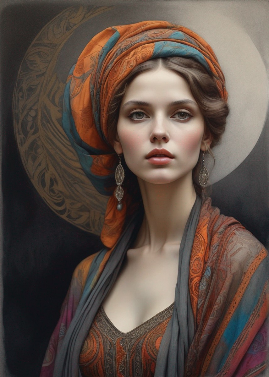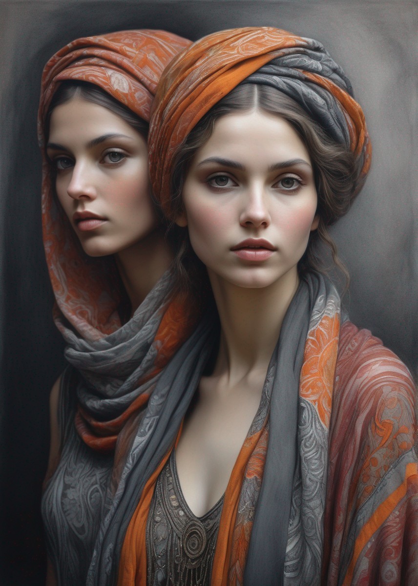 Two women with intricate headscarves gaze solemnly against a dark background, showcasing detailed fabric textures and subtle lighting.