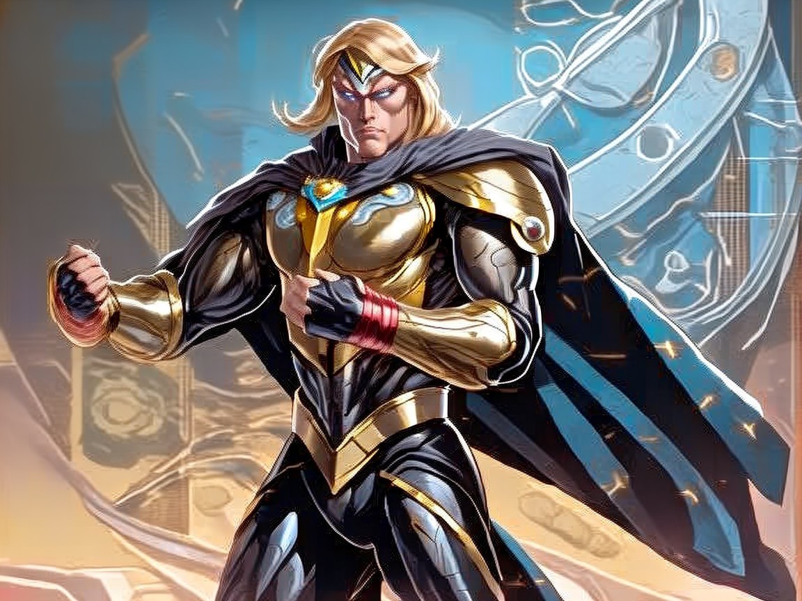 A heroic figure with long blonde hair and striking blue accents on his face, dressed in a golden and black armored suit, exudes power and confidence against a dynamic, colorful background.