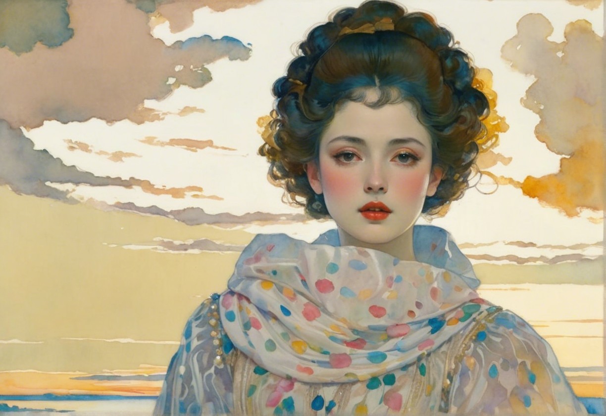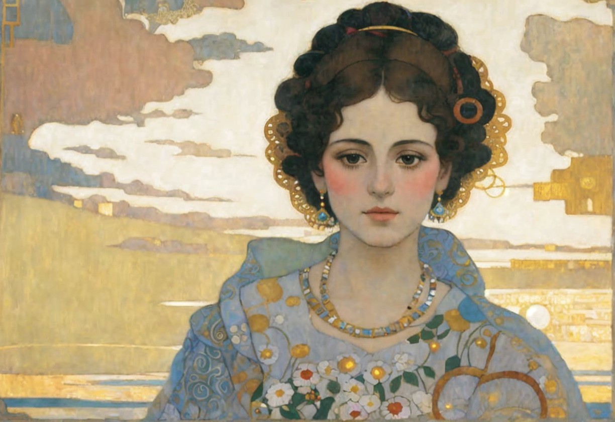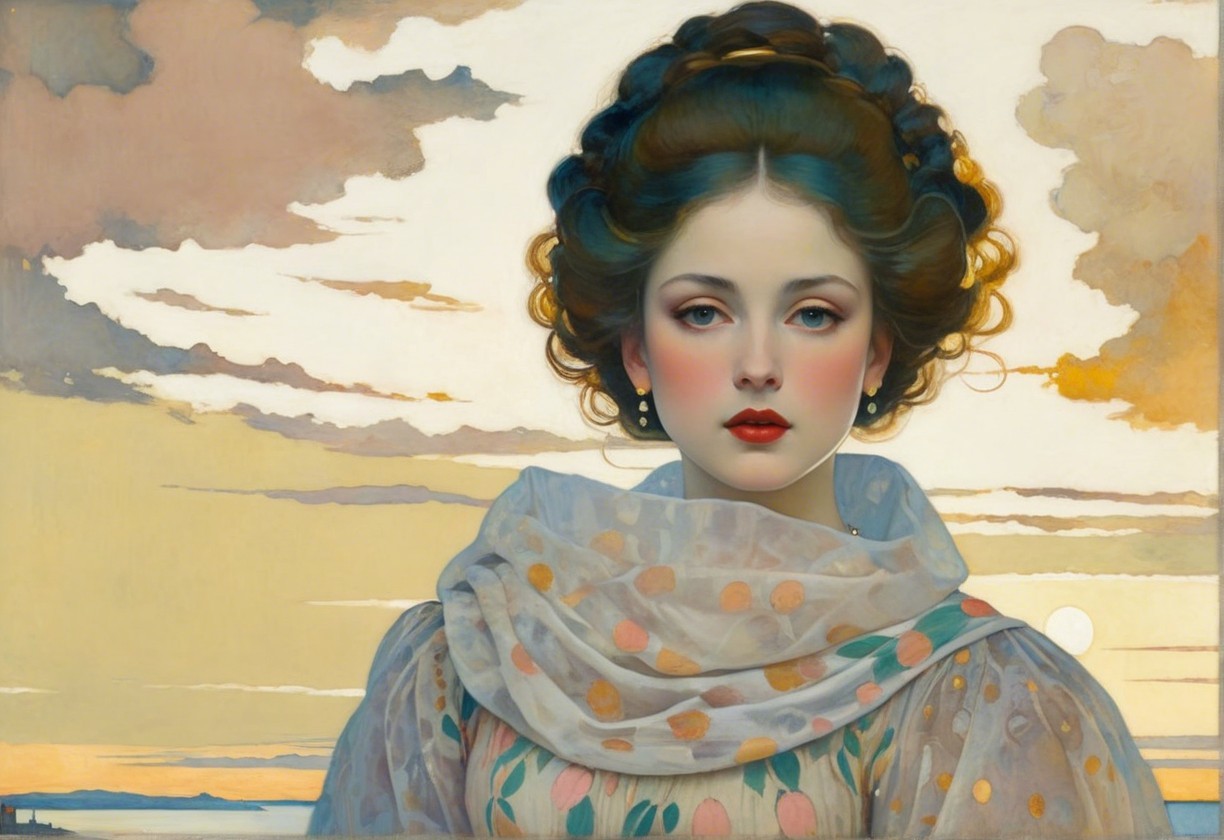 A serene portrait of a woman with wavy brown hair, adorned in a blue scarf featuring gold patterns. The background features a tranquil seascape at sunset, enhancing her elegant presence.