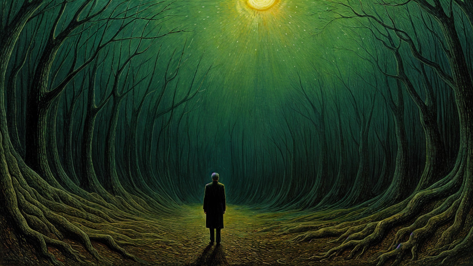 A serene scene by a lake at sunrise, with a person sitting peacefully on the shore. Rays of light shine through trees, and birds gracefully fly above the water, creating a tranquil atmosphere.