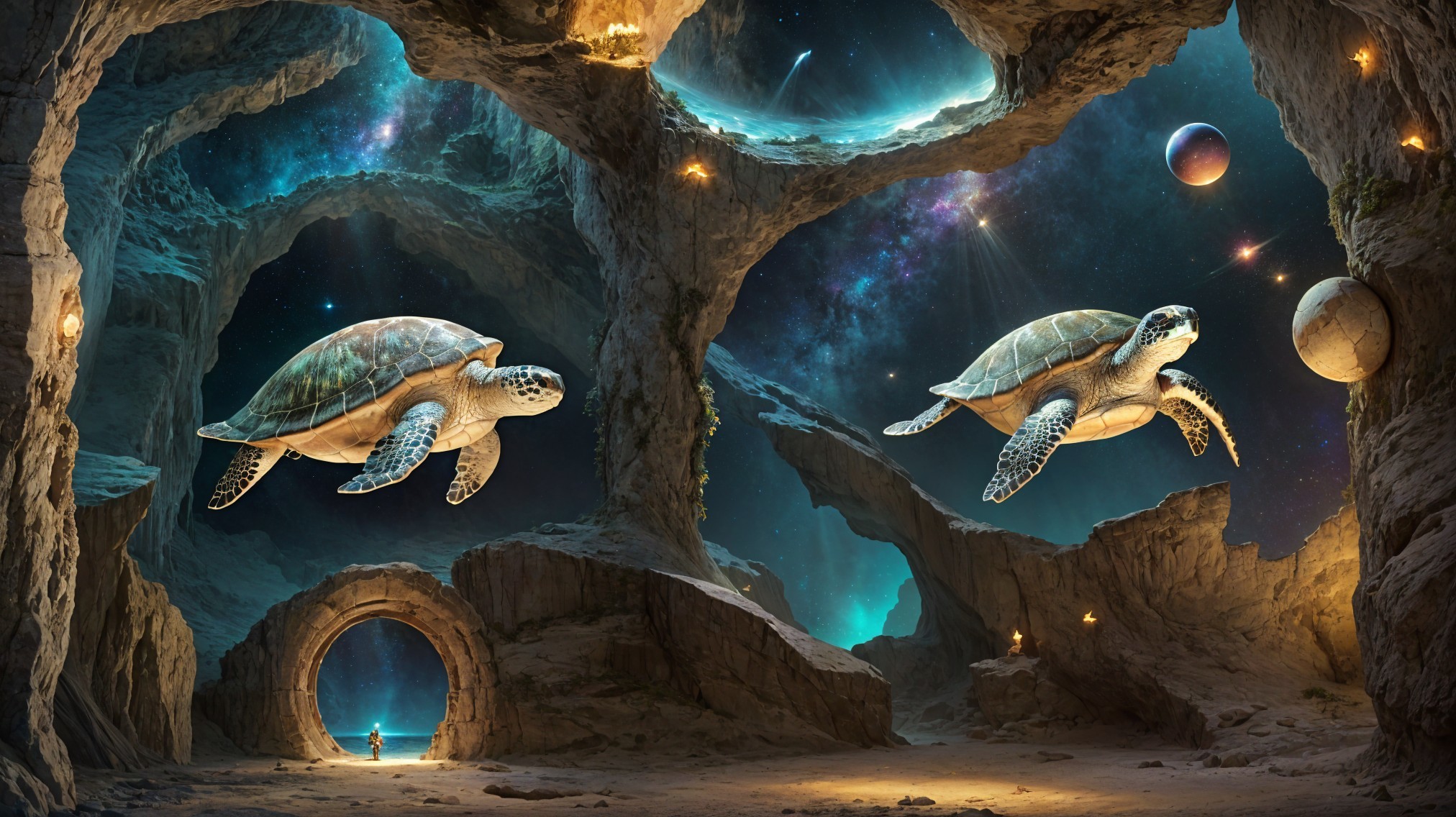 Two sea turtles swimming in a surreal, cavernous space with starry skies and celestial bodies visible through circular portals.